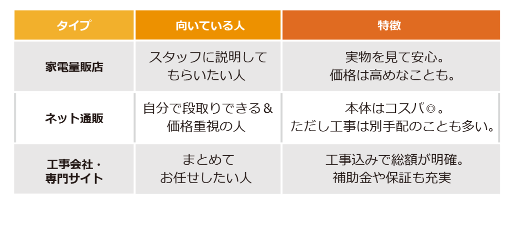 エコキュートを買う場所は、ざっくりこの3パターン。